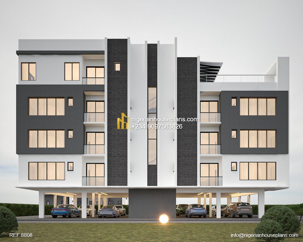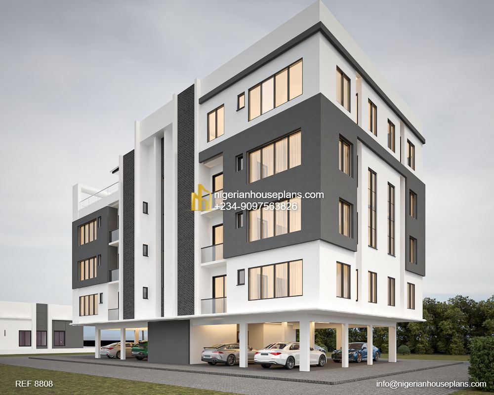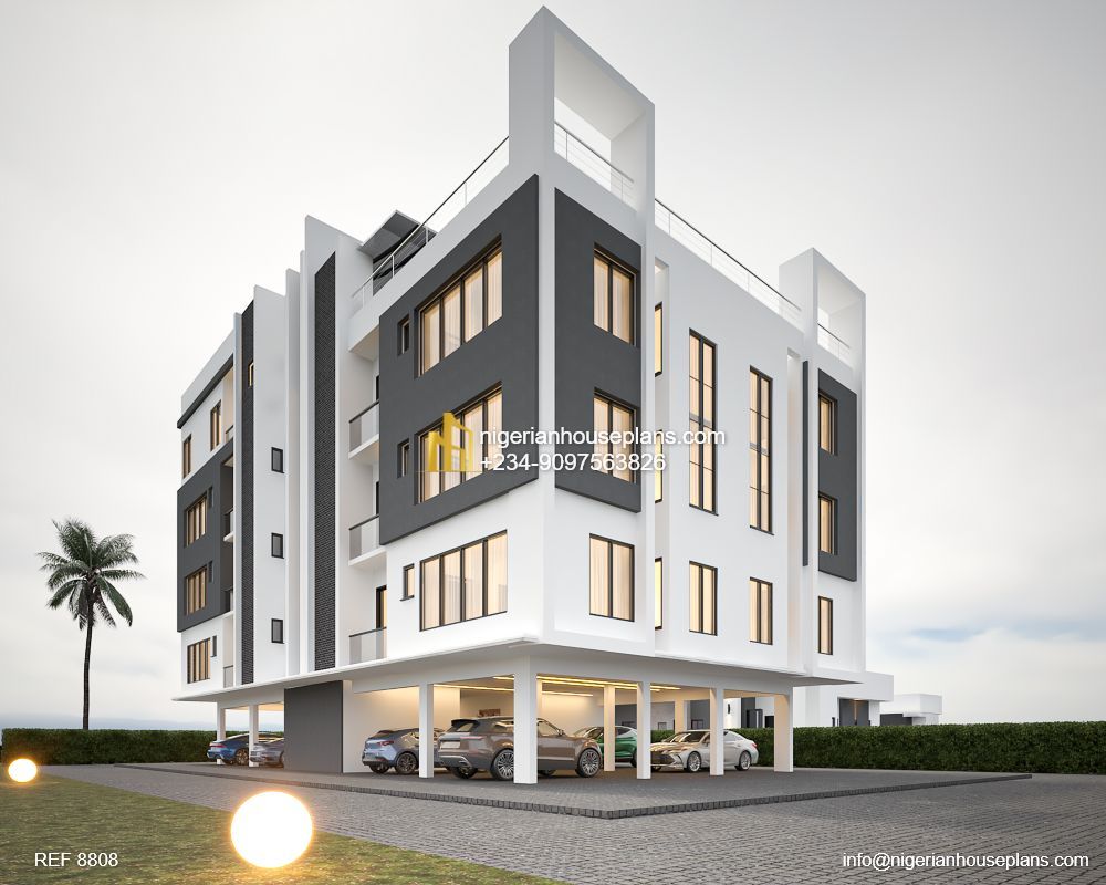 A contemporary apartment building with ground floor parking, stairs/ lifts, 2 units of 2 bedroom apartments on each floor and a 3 bedroom pent floor apartment with sweeping views of the surroundings.